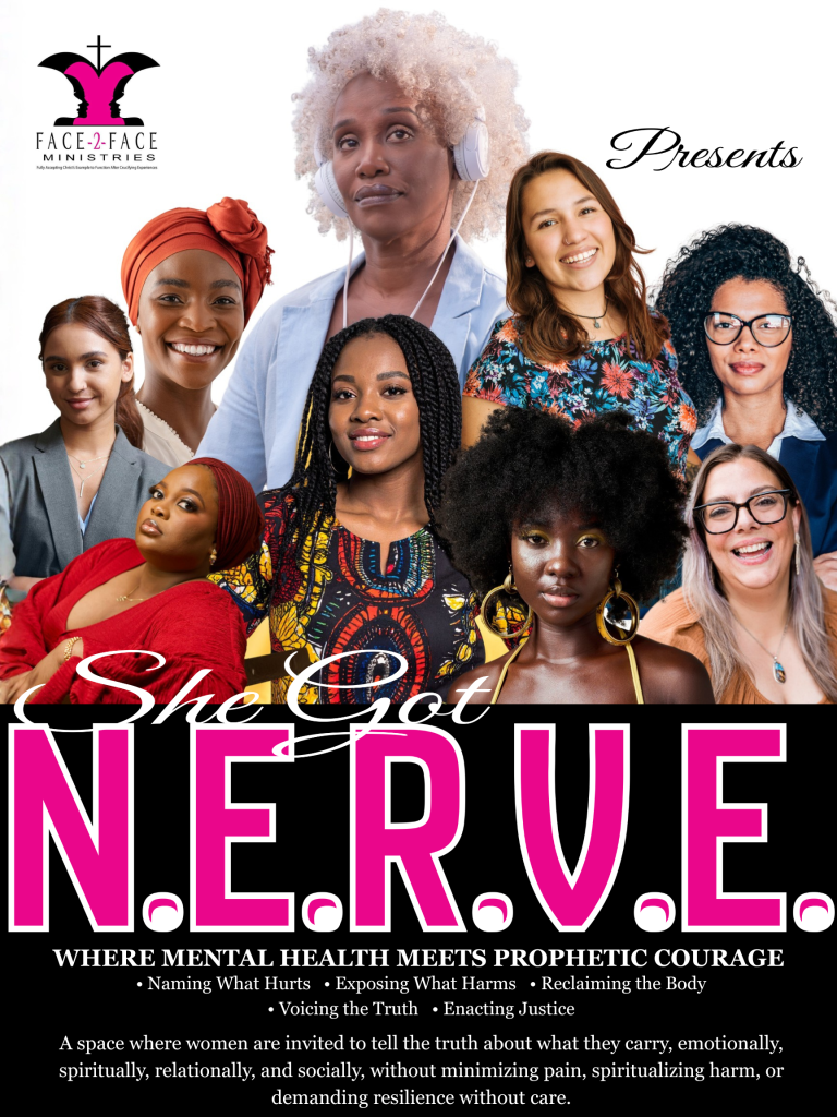 She Got N.E.R.V.E. is a trauma-informed, faith-rooted program of FACE –2– FACE Ministries designed to support women at the intersection of mental health, embodied healing, and prophetic courage.